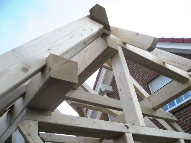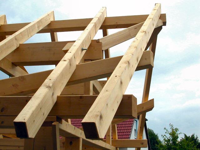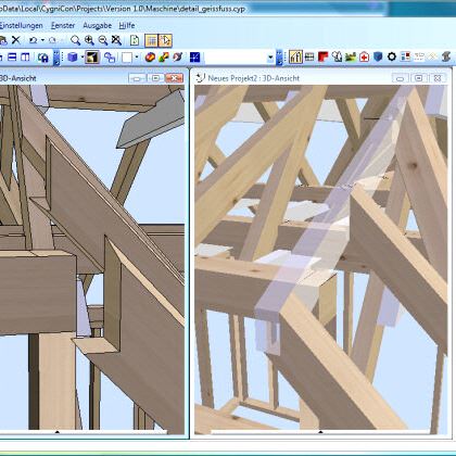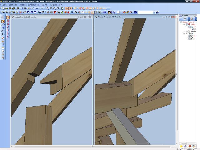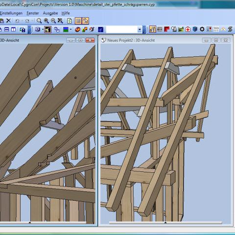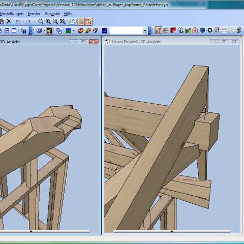 Im Jahr 2008 haben wir ein CAD/CAM - Modul auf Basis von Cygnicon entwickelt. Vor der Freigabe der ersten Version wurde ein Praxistest durchgeführt. Dafür wurde ein Musterhaus geplant, gefertigt und aufgestellt. Natürlich wurden sämtliche Planungen und Arbeitsvorbereitungen mit dem von uns entwickelten CAD/CAM - Modul durchgeführt. So wurde die Tragkonstruktion konstruiert und die Holzverbindungen ausgearbeitet. Weiterhin die Montagezeichungen geplottet sowie die CNC-Ansteuerung für den Holzzuschnitt erzeugt. Um eine möglichst große Vielfalt an Varianten zu testen wurden bewusst ungewöhnliche Konstruktionen gewählt. Der Holzbalkenzuschnitt erfolgte mit einer CNC-Maschine vom Typ Hundegger K2-5. Beim Richten konnten wie alle Bauteile passgenau ohne Nachbearbeitungen zusammen fügen. Lediglich bei der 3D-Tasche mussten wir eine kleine Korrektur durchführen. Hier hatten wir Übersehen das die Rotationsreihenfolge nicht X,Y-Z ist. Das hatte zur Folge das das linke schräge Kopfband nicht passte. Wir korrigieten das umgehenden und ließen das Bauteil nochmals fertigen.